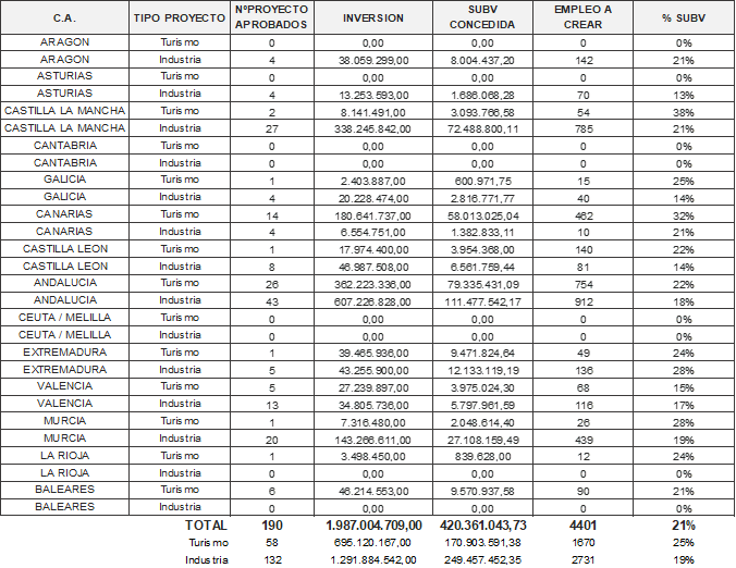 Junto a estos datos, en Comunidades Autónomas “turísticas” hemos tenido unas cuotas de participación en el reparto de fondos durante el 2024 del 96% en Baleares, el 91% en Comunidad Valenciana, del 81% en subvención para hoteles en Canarias, o del 61% de la inversión hotelera subvencionada en Andalucía.